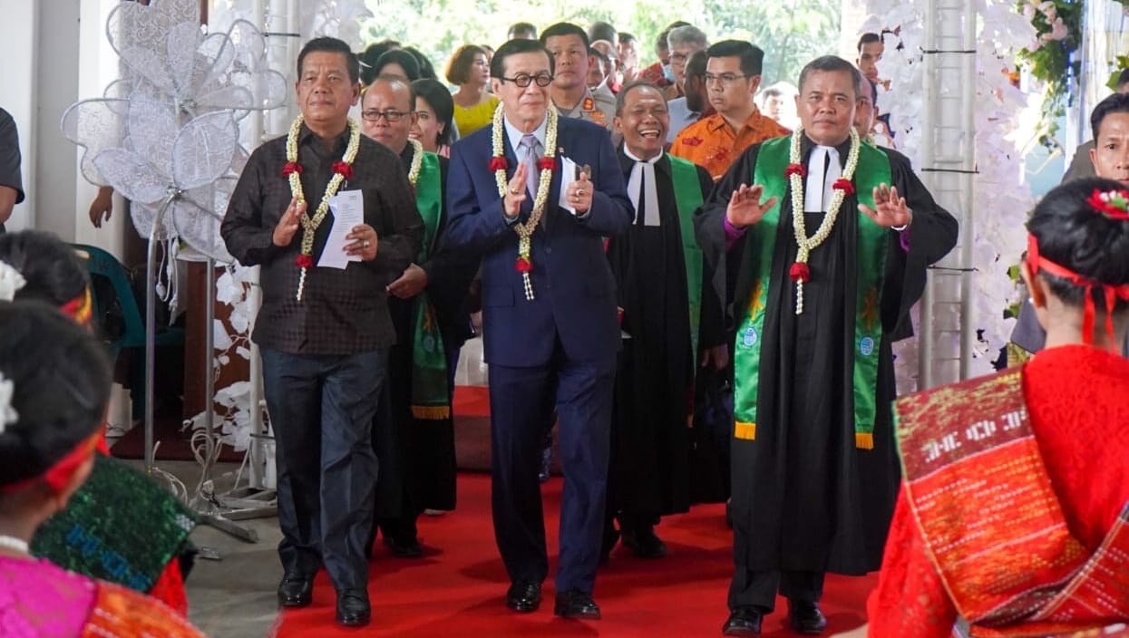 Bupati Simalungun Radiapoh Hasiholan Sinaga bersama Menteri Hukum dan HAM RI Yasonna H Laoly di dampingi Kapolres Simalungun AKBP Ronald FC Sipayung menghadiri acara Sinode Am Kerja (SAK) XXIII GKPI Tahun 2023.
