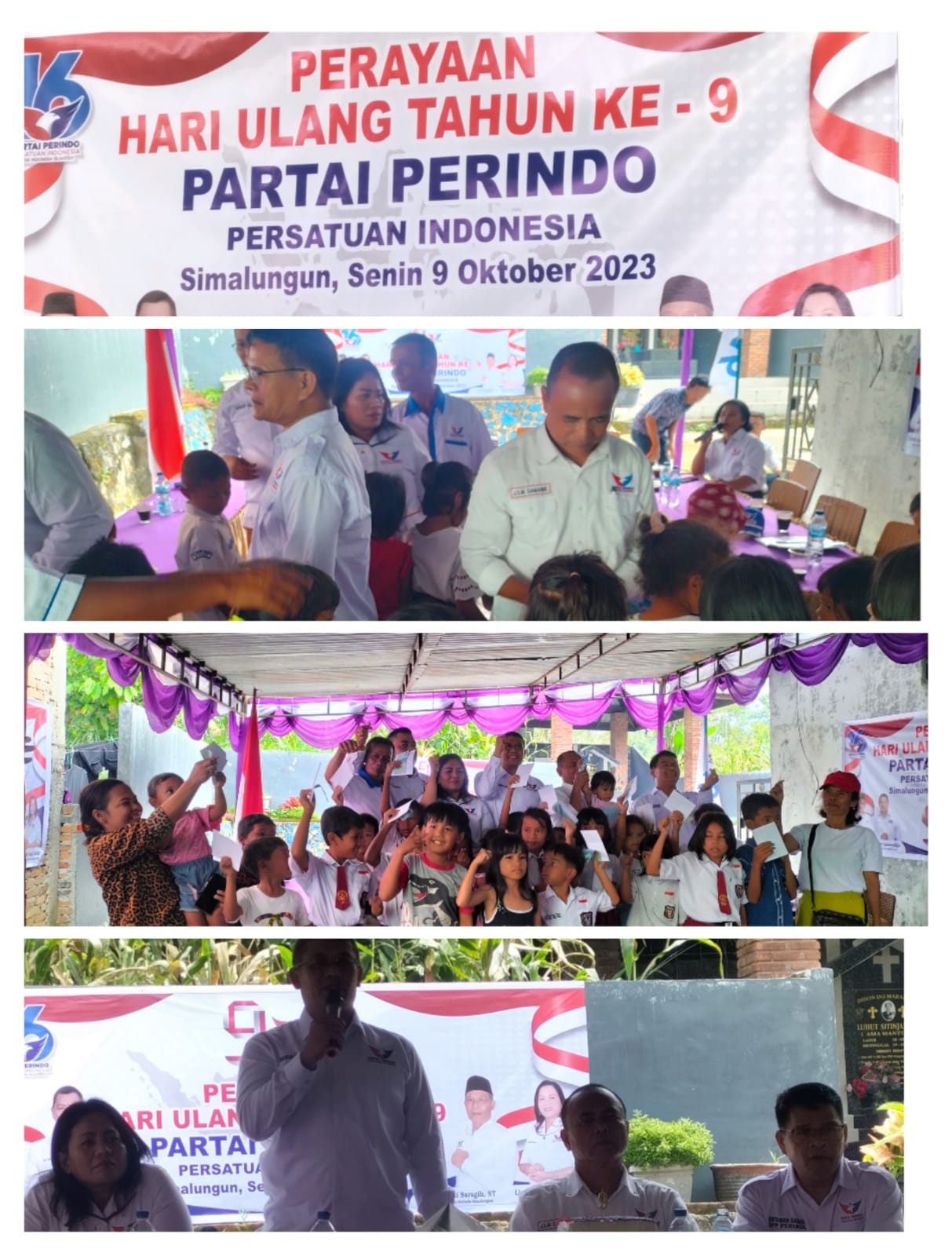 Partai Perindo DPD Kab.Simalungun Pada Perayaan HUT Ke-9 Tahun ini juga memberikan Santunan Kepada Puluhan Anak Yatim-Piatu yang hadir Yang disampaikan oleh Ketua DPD Partai Perindo Sariadi ST dan Mewakili DPP Pusat Bapak Sortaman Saragih M.Kes.