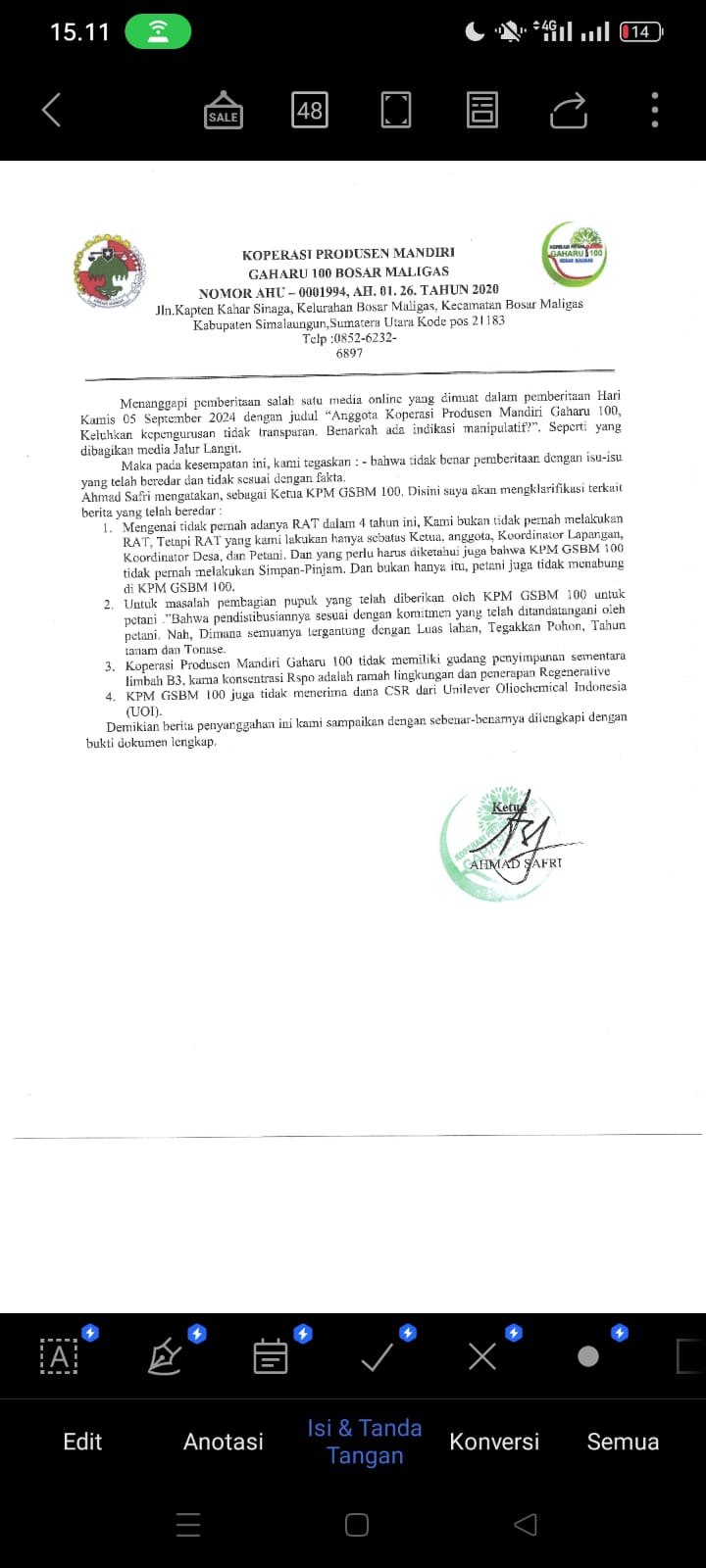 Jalurlangit.id || Simalungun, Menanggapi pemberitaan salah satu media online yang dimuat dalam pemberitaan Hari Kamis 05 September 2024 dengan judul “Anggota Koperasi Produsen Mandiri Gaharu 100, Keluhkan kepengurusan tidak transparan. Benarkah ada indikasi manipulatif?”, Ketua Koperasi memberikan hak jawab, berikut hak Jawa dan klarifikasinya;