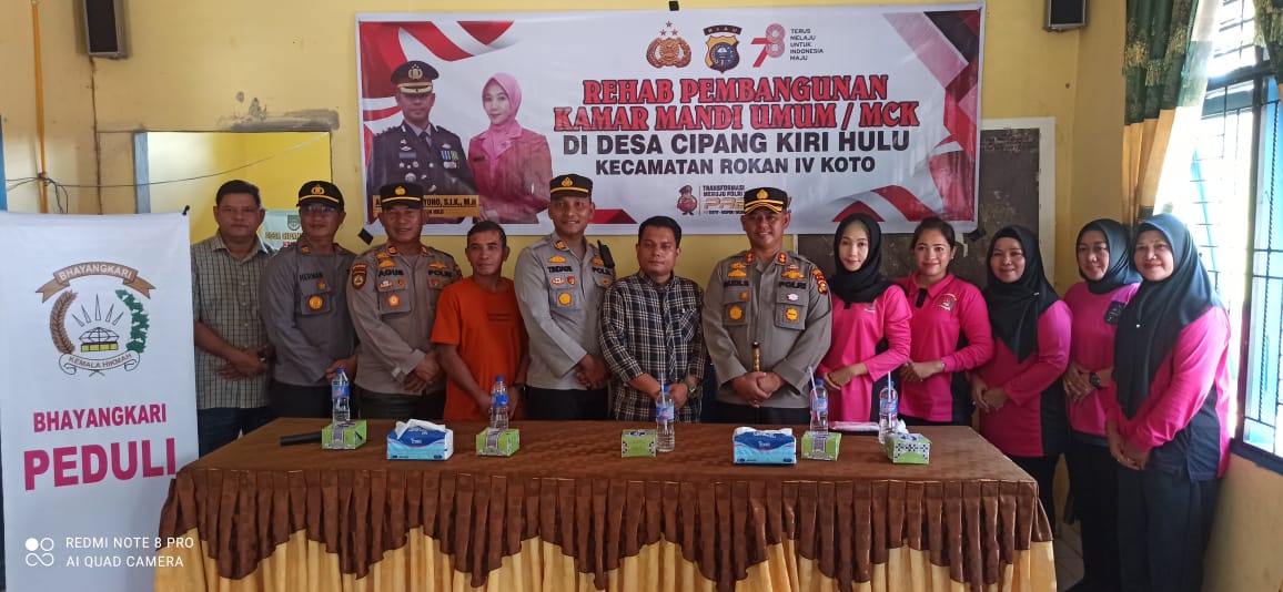 ROKAN HULU- Giat Bhayangkari Peduli dalam momen rangkaian Hari Kesatuan Gerak Bhayangkari (HKGB) ke 71 Di Desa Cipang Kiri Hulu Kecamatan Rokan IV Koto Kabupaten Rokan Hulu (Rohul), rehab Pembangunan Kamar Mandi Umum atau MCK, Minggu (27/8/2023) sekitar pukul 12.00 Wib.