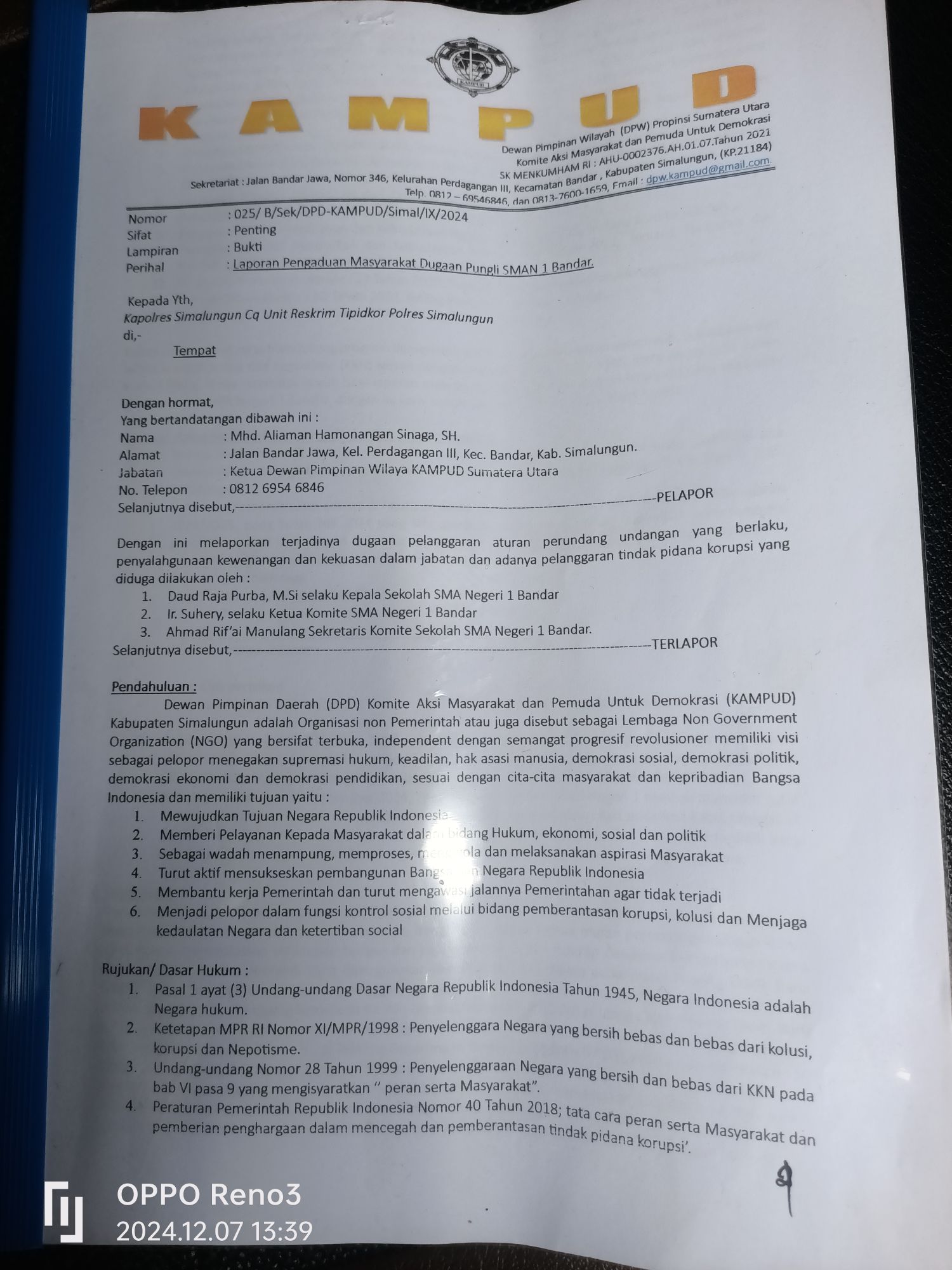 “Surat kami nomor : 025/B/Sek/DPD-KAMPUD/D/Simalungun/IX/2024, tanggal 14 September 2024, berisikan beberapa dugaan Pungli dan penyalahgunaan jabatan, kita laporkan Kepala Sekolah dan Komite Sekolah SMA Negeri 1 Bandar kepada Polres Simalungun sejak tanggal 14 September 2024 yang lalu dan bukti permulaan yang cukup untuk proses penyelidikan sudah kita berikan, akan tetapi sampai sekarang unit Reskrim Tipidkor Polres Simalungun belom mengetahui apakah laporan yang kami sampaikan ada unsur pidana korupsinya, ucapnya.