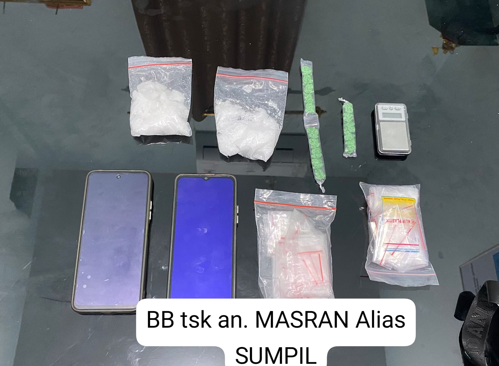 Adapun barang bukti yang diamankan dari Masran alias Sumpil yaitu 1 (satu) buah plastik klip transparan ukuran besar berisi Narkotika Shabu dengan berat brutto 44, 30 gram, 1 (satu) buah plastik klip ukuran besar yang berisi Narkotika Shabu dengan berat brutto : 42,63 gram, 1 (satu) buah transparan berisi 20 (dua puluh) butir Narkotika jenis pil ekstasi berat brutto : 10,79 gram, 1 (satu) buah plastik transparan berisi 10 (sepuluh) butir Narkotika jenis pil ekstasi dengan berat brutto : 5,31 gram, 1 (satu) unit timbangan elektrik, 2 (dua) buah plastik klip berisi plastik klip kosong ukuran sedang, 1 (satu) buah pipet berbentuk skop, 1 (satu) buah tas kecil warna hitam, 10 (sepuluh) buah plastik klip transparan kosong ukuran besar, 10 (sepuluh) buah plastik klip transparan kosong ukuran kecil, 1 (satu) buah sendok plastik, 1 (satu) unit handphone android merk Vivo warna ungu, 1 (satu) unit handphone android merk Redme warna hitam.