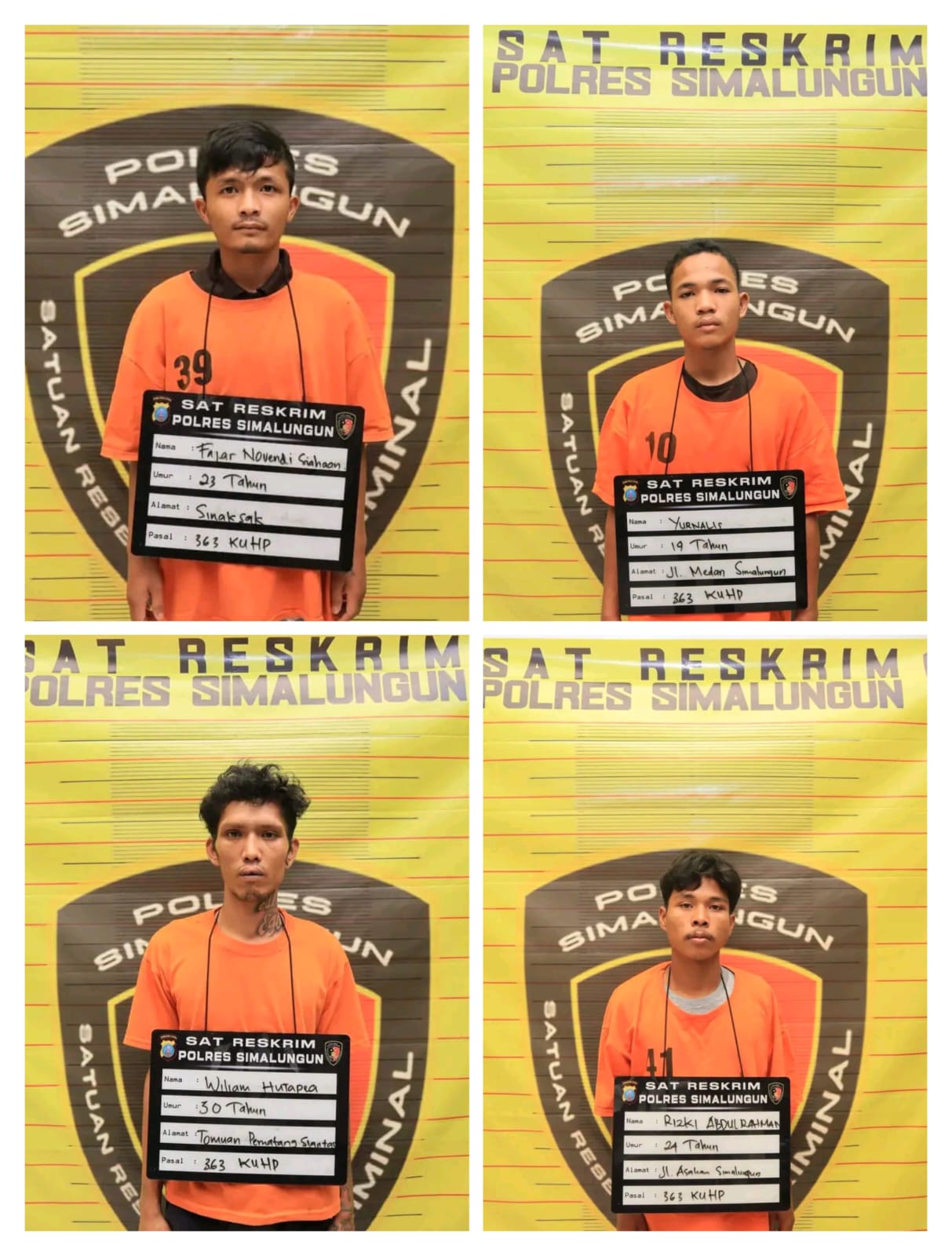 Fajar Novendi Siahaan (23 tahun) warga Jalan Indah Sari, Kecamatan Tapian Dolok Kabupaten Simalungun dan yang terakhir adalah Yurnalis Syah Harefa (20 tahun), warga Jalan Batu Permata Raya Kelurahan Sitalasari Kecamatan Siantar Sitalasari, Kota Pematang Siantar, keempatnya berprofesi sebagai supir, “ungkap Sugeng.