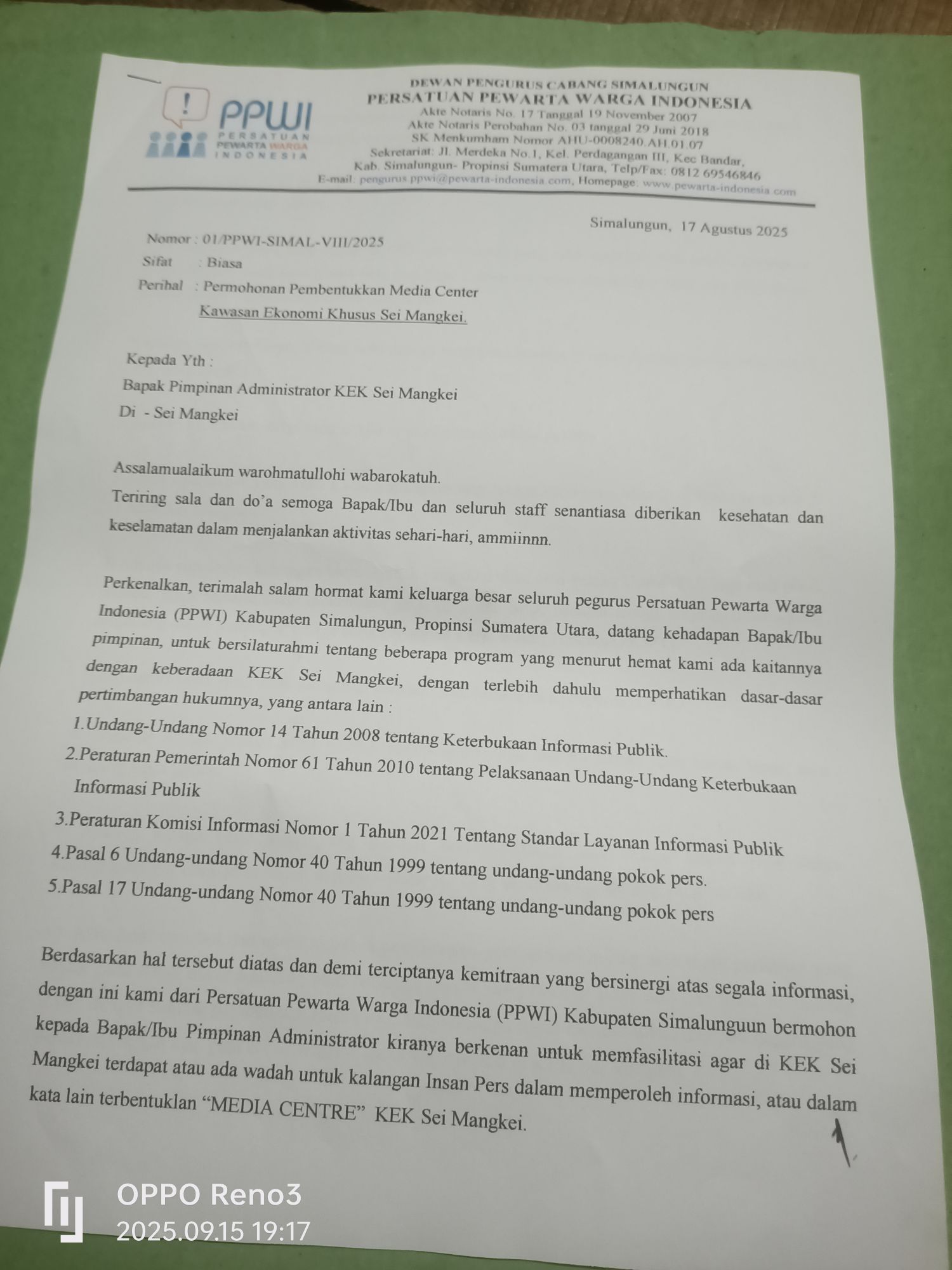 *PPWI Simalungun Usulkan Wadah Dibentuknya Media Center, PLH Sekjen Sampaikan Surat Resmi ke Administrator KEK Sei Mangkei*