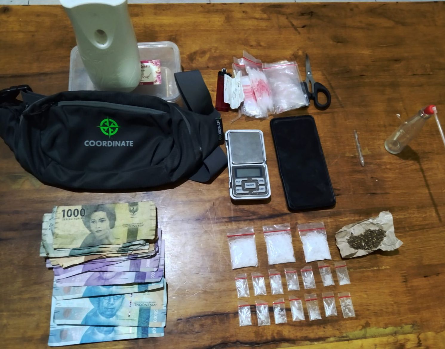 Selanjutnya team juga mengamankan 1 (satu) set bong / alat hisap shabu2 dan kaca pyrex yang berisi diduga narkotika jenis sabu-sabu dengan berat brutto 1,30 gram, 1 (satu) unit timbangan digital warna silver, Uang sejumlah Rp. 238.000,- 1 (satu) unit HP android warna hitam merk Samsung, 1 (satu) korek mancis warna merah, 1 (satu) kotak Tupperware warna putih, 1 (satu) kaca pirex, 3 (tiga) ball plastik klip kosong dan 1 (satu) tas sandang warna hitam, “jelas AKP Adi.