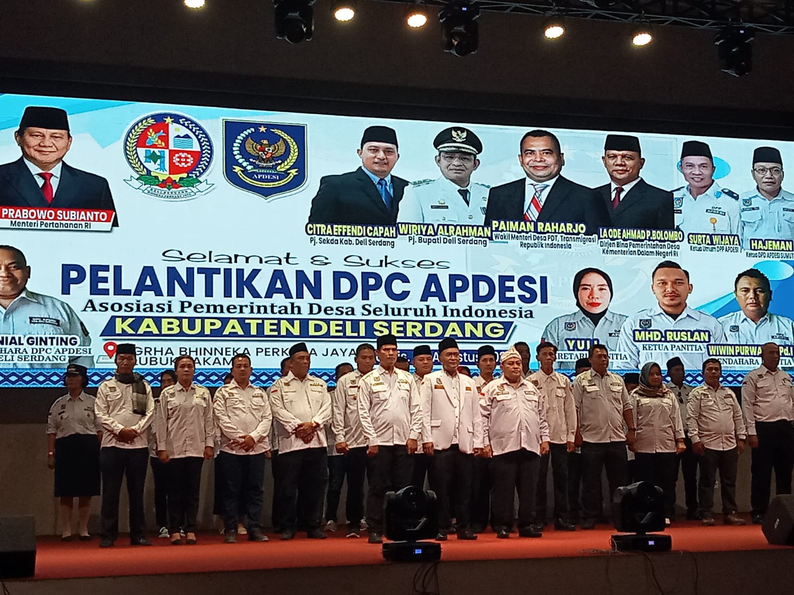Jalurlangit.id | Deli Serdang – Pelantikan Asosiasi Kepala Desa Seluruh Indonesia (APDESI) Deli Serdang Hardono siap kawal pembangunan Desa tertinggal dihadiri oleh Wakil Menteri Desa Pembangunan Daerah Tertinggal Dan Transmigrasi Republik Indonesia Prof.Dr.H.Paiman Raharjo,M.Si. tepatnya di Graha Perkasa Jaya Sebrang Depan Kantor Bupati Deli Serdang Kamis (08/08/2024).