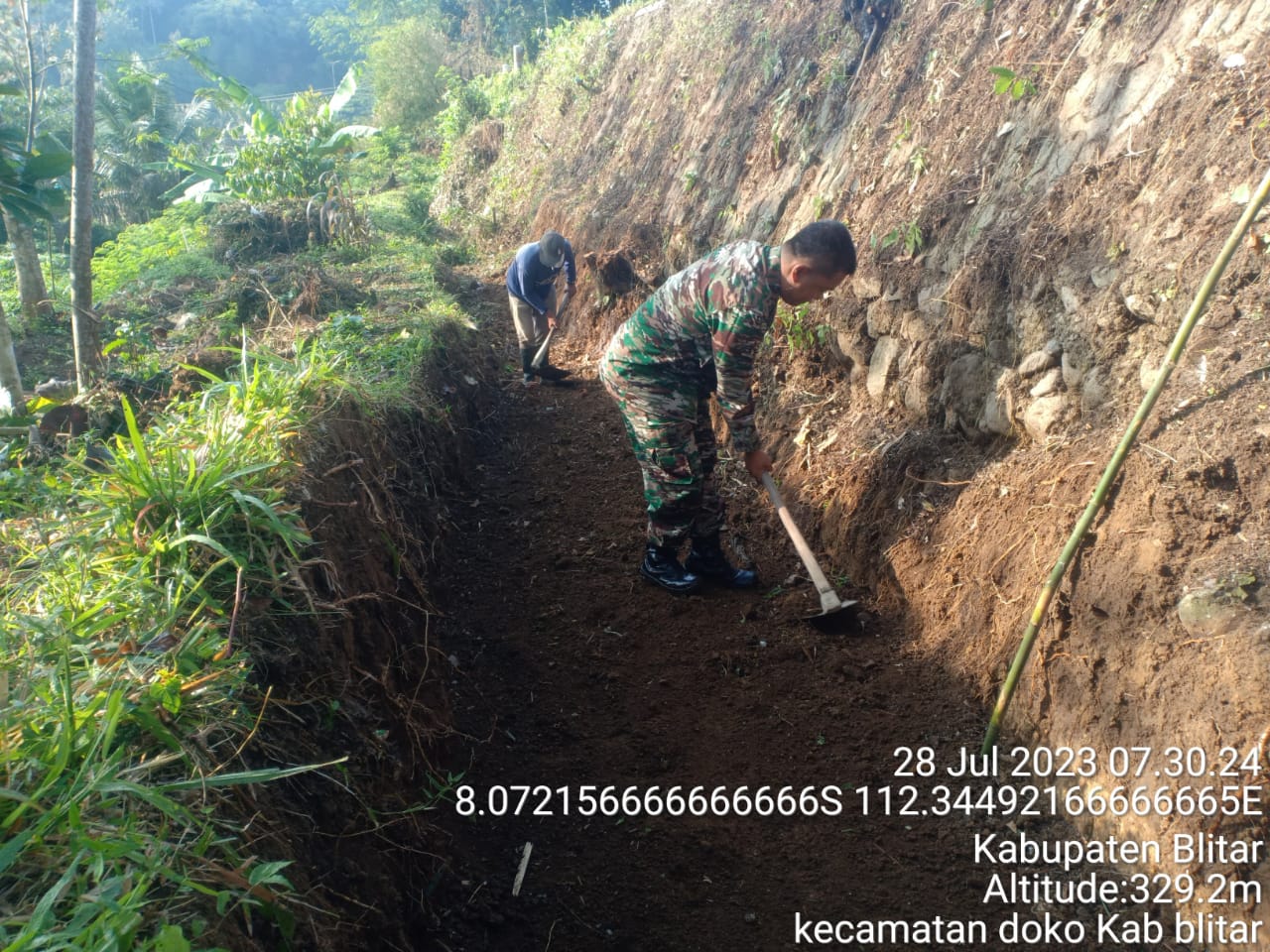 Blitar – Babinsa Koramil 0808/13 Doko Kodim 0808/Blitar Sertu Supriendi dan warga masyarakat, melaksanakan kegiatan kerja bakti dan gotong royong bersama membangun saluran irigasi, bertempat di Desa Plumbangan Kec. Doko Kab. Blitar, Jumat (28/7/2023).
