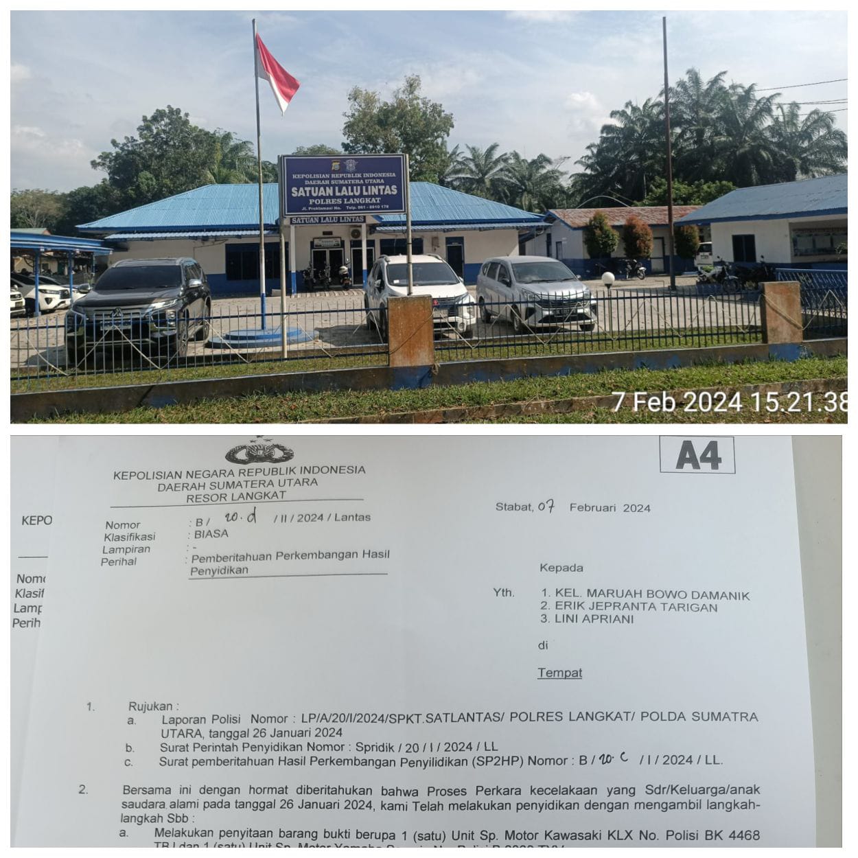 “Hari ini kita tahan sipelaku Erik Jepranta Tarigan, pak, ucap penyidik pembantu kepada orangtua korban, Rabu, 7/02/2024.