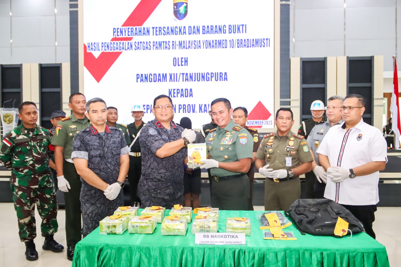 Dalam kesempatan ini tersangka dan barang bukti sabu seberat 10,638 Kilogram diserahkan oleh Mayjen TNI Iwan Setiawan kepada Kepala BNNP Kalbar Brigjen Pol. Drs. Sumirat Dwiyanto, M.Si. Tersangka merupakan WNI berinisial Rd, pria asal Bima, Nusa Tenggara Barat.